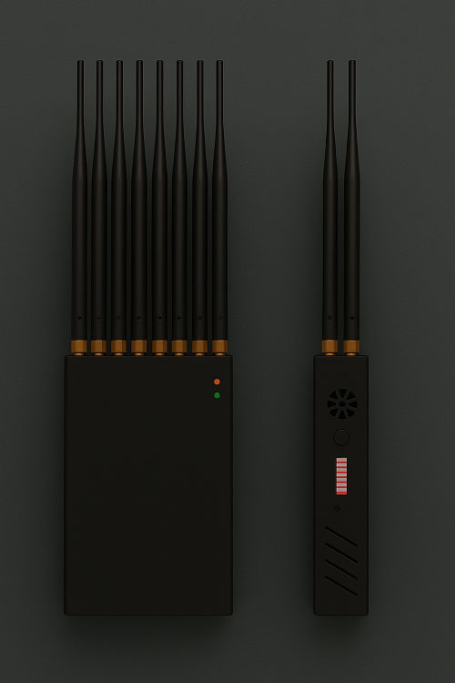 - Bandas de inhibición: 433 MHz, 915 MHz, 2.4 GHz, 5.8 GHz, GNSS (L1/L2, GLONASS, BeiDou, Galileo, NAVIC, QzSS).